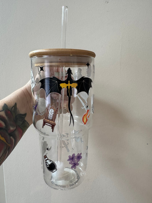 Fourth Wing Inspired Glass Tumbler with Handle, Bamboo lid and Glass straw - 750ml