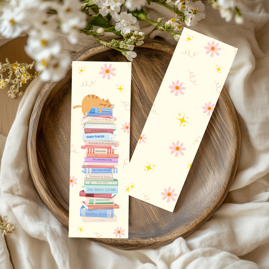 🐾 Cat Book Stack Bookmark – Cute Cat Sitting on Punny Book Titles 📚🐱