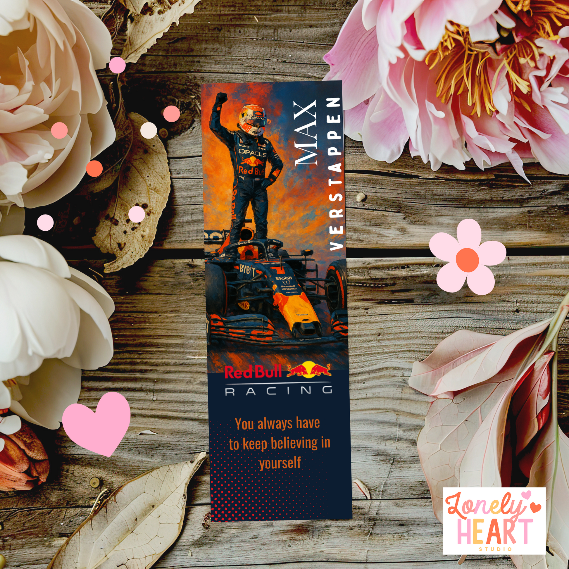 Race through your reading list with this set of four playful Formula One bookmarks featuring Lando Norris, Max Verstappen, Charles Leclerc, and Lewis Hamilton.