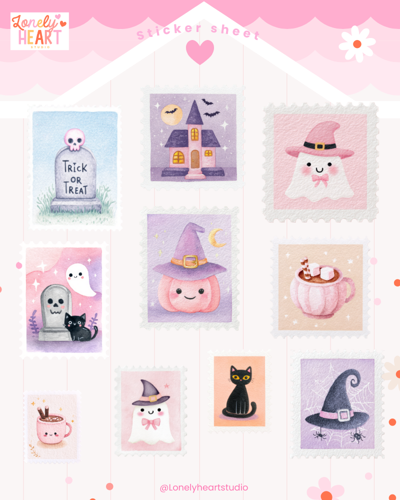 Add a whimsical touch to your Halloween with this Pastel Halloween Stamps collection sticker sheet.